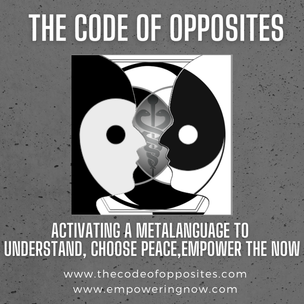 Do you have a communication issue? That is, you know what to do to be successful, but you just don’t want to do it? If language is the problem, it is also the solution. The Code of Opposites (TCO) introduces an idea whose time has come: a newly revealed metalanguage to feel the resistance, choose peace, and emPower the NOW.