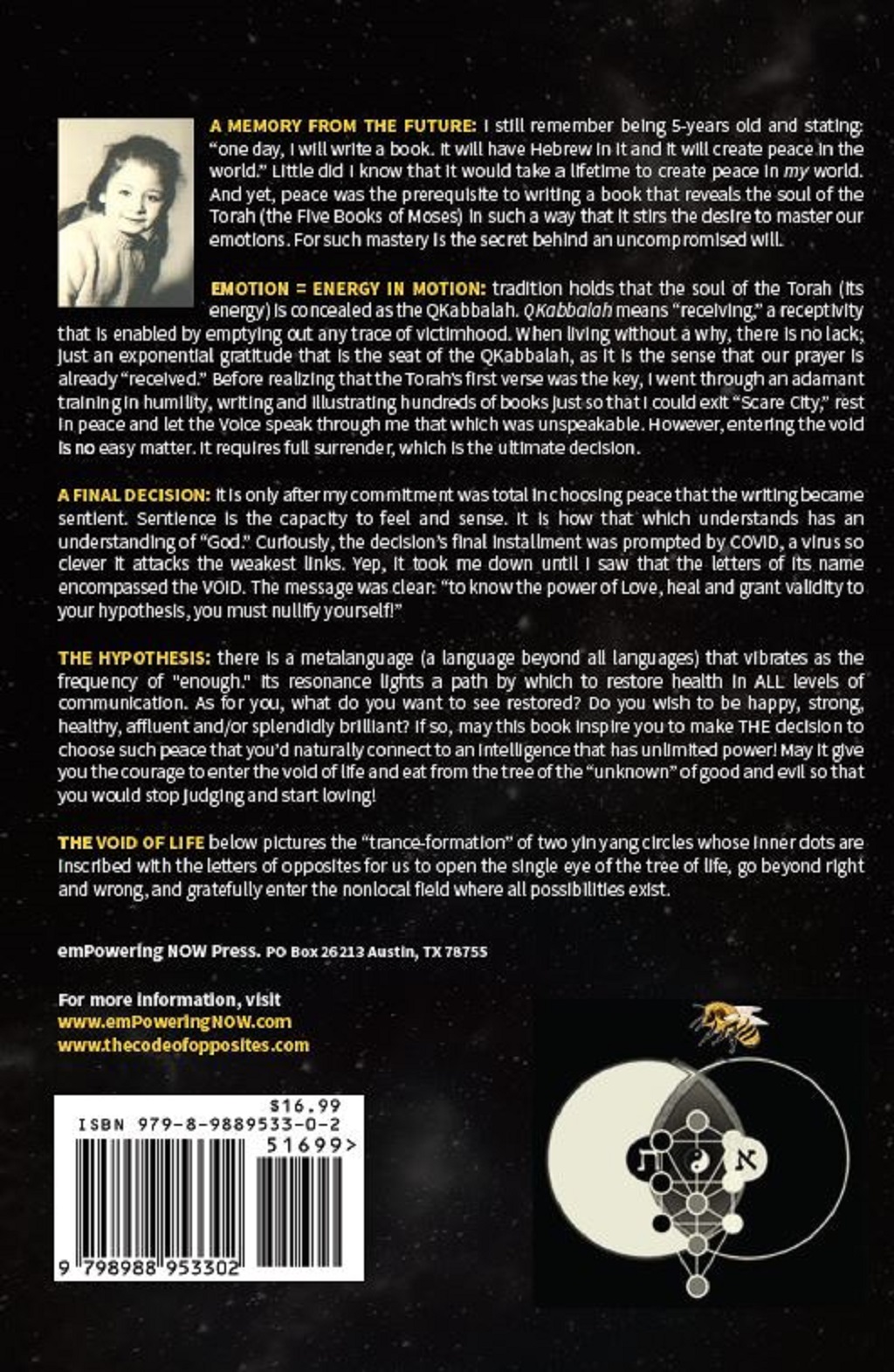 THE VOID OF LIFE pictures the “trance-formation” of two yin yang circles whose inner dots are inscribed with the letters of opposites for us to open the single eye of the tree of life, go beyond right and wrong, and gratefully enter the nonlocal field where all possibilities exist.